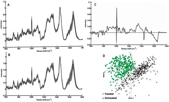 Mean baseline corrected spectrum along with standard deviation (shaded region) acquired from group of cells: (A) Untreated; (B) Treated; (C) difference spectrum (Untreated − treated); and (D) PCA scatter plot.