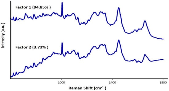 To further evaluate the feasibility of our setup to acquiring data from large number of cells in a short time period, spectra from ~400 cells were obtained. The average spectra and standard deviations are shown in Figure 4. Bands related to both nucleic acids and proteins were observed. Visible differences among both groups could be linked to the Bortezomib-induced changes of characteristic peaks corresponding to the symmetric and asymmetric stretching of nucleic acids (600–800 cm−1), backbone geometry, and phosphate ion interaction (800–1200 cm−1), suggesting structural degradation of the nuclear material. A minor blue shift in the phenyalanine band (1003 cm−1) was also observed in the Bortezomib-treated cells. These differences were further enhanced for visualization by computing the difference spectra (untreated − treated). In this case, all positive bands belonged to the untreated group of cells and all the negative bands belonged to treated cells. Similar to the changes previously observed in the nuclear component of individual cell, positive bands around 783, 788, 804, 1340, and 1490 cm−1 can be predominantly observed in the untreated group (Figure 4C). Other positive bands at 1053 cm−1, 1123 cm−1 (C-N stretching of proteins), amide III, 1460 cm−1 (lipids) and 1558 cm−1 (tryptophan) suggest high protein concentration in the untreated cells compared to the treated cells [30]. Strong bands around the phenylalanine region could be due to the minor blue shifts in treated cells reported above. Predominant negative bands around 1440 cm−1 (CH2 deformation) and 1660 cm−1 (amide I) could be due to changes in the secondary structure of proteins from the Bortezomib treatment. The spectral profiles obtained from group of cells support earlier observations on individual cells. To verify if these differences can be utilized for differentiating between treated and untreated cells, PCA was performed. As shown in Figure 4D, two separate clusters of “treated” and “untreated” cells were obtained under PCA. Spread in the cluster of “treated” group could be due to the differential effect of Bortezomib during cell cycle division. As Bortezomib induces apoptosis, it will have varying effects on each cell depending on the cell cycle phase. Loading plots of factors, along with percentage contributions used for classification, are shown in Figure 5. Majority of differences responsible for discrimination seems to originate from factor 1. Corroborating spectral variability indicated by difference spectra (Figure 4C), loading plots also suggest major differences in nuclear and protein content of the cells. Shifting in phenylalanine band also contributes to the classification. Major differences between factor 1 and 2 is in the amide I band. These findings support earlier observation regarding mode of action of the drug. As demonstrated on single cell, the drug works by influencing the nuclear composition, disrupting the intracellular demarcation and ultimately leading them towards apoptosis. Overall, findings support the utility of the current set-up in identifying earliest changes in group of cells, suggesting its applicability for label-free monitoring drug response in a fast and sensitive manner.