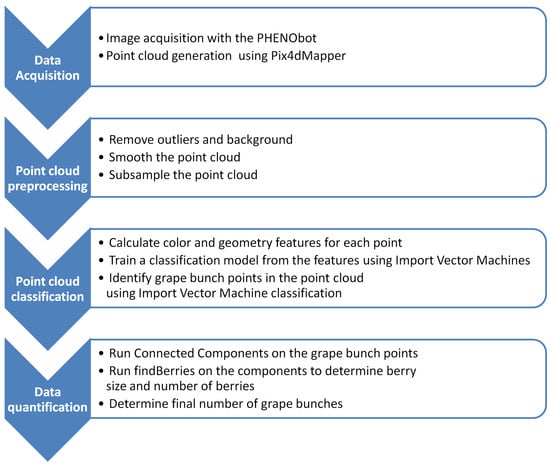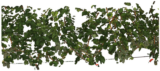 In recent years, only a few 3D phenotyping approaches have been published in viticulture. Dey et al. [23] used an MVS algorithm on images manually collected with a consumer camera to reconstruct colored point clouds of grapevine rows. The point cloud was then classified into the classes grape bunches, leaves and branches using support vector machines and geometric features based on principal component analysis, as well as color features. They reached a classification accuracy of 96%–98%. As their focus lays on point cloud classification, no comments on the effectiveness of the data acquisition were made, and the point clouds were arbitrarily scaled. No phenotypic data were derived.