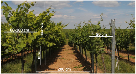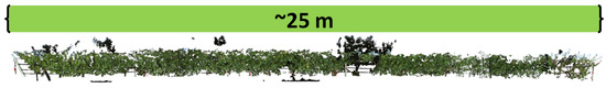 Two rows of Riesling, each with 25 vines, have been used for the setup of the phenotyping pipeline. Vines are planted at the experimental vineyards of Geilweilerhof located at Siebeldingen, Germany (Lat 49°132.892, Lon 8°248.408). Inter-row distance was 2 m, and grapevine spacing was 1 m. Rows were planted in a north-south direction. Vines have been trained in two different ways to demonstrate the phenotyping pipeline on two different measuring scenarios with different complexities. One row was trained in the traditional vertical shoot positioned (VSP) trellis system (see Figure 2 and Figure 3). In this scenario, the canopy density is rather low with a canopy width of approximately 50 cm and a grape bunch zone of roughly 50 cm located at the lower part of the grapevine canopy. The second row contained semi-minimal-pruned-hedge (SMPH) trained vines. These are more vigorous with a higher canopy density and width (60–100 cm). In this training system, grape bunches are allocated throughout the whole canopy height with smaller bunches and berries compared to the VSP system.