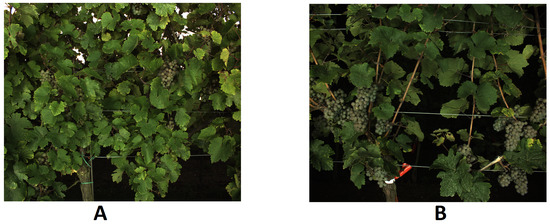 (A) A grapevine row trained as SMPH; (B) A grapevine row trained as a VSP trellis.