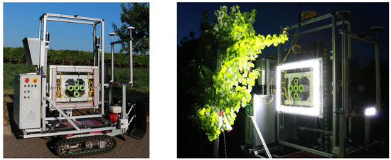 Image acquisition was done at night to guarantee homogeneous illumination conditions. Driving speed was about 0.3 km/h. Initial camera height above the ground was at 110 cm. An image was taken approximately every 15 cm along the path while moving through the grapevine row by manually pressing a button by which the lightning unit was triggered and the GPS position automatically written in the images’ Exif (Exchangeable Image File Format) file header. Considering the driving speed, the baseline of 15 cm ensured an image overlap of 80%–90%, which is necessary for high detail and accurate point clouds. The high screening rate reduces the effect of occlusion as points of a grape bunch are seen from multiple views. In this way, the whole row was screened. To reduce the effect of occlusion and as an image taken from a height of 110 cm did not capture the full height of the grapevines, the procedure was repeated at camera heights of 130 cm and 150 cm driving along the same path as before.
