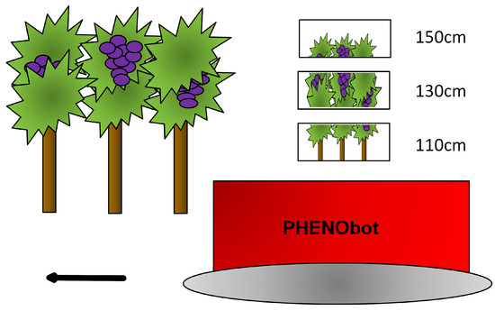 Please refer to [11] for a detailed description of the PHENObot and the data acquisition software. Data acquisition was done after sunset using the lighting unit to achieve homogeneous lighting conditions. The PHENObot moved between the grapevine rows with the camera looking to the right of the path direction. The distance of the camera to the grapevines was 50–75 cm. Please see Figure 5 for an illustration of the scenario.