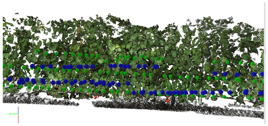 Part of the reconstructed SMPH grapevine row (25 m). The dark background is clearly visible. Blue spheres indicate initial GPS positions of the cameras. Green spheres indicate final camera positions corrected during bundle adjustment.