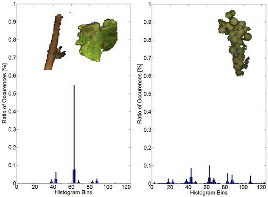 (Left) Typical surface feature histogram (SFH) for the canopy; (Right) Typical SFH for grape bunches.