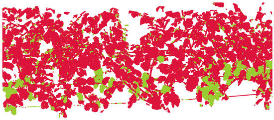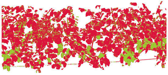 Initially classified point cloud. Red points belong to the canopy and green points to the grape bunch class. False classifications are recognizable, especially where objects lie close together. Point regions belonging to the grape bunch class contain points falsely classified as canopy and vice versa.