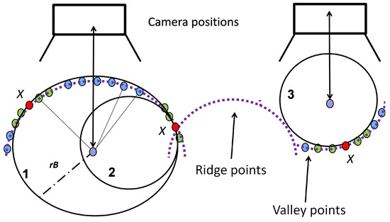 Scenario for berry quantification. Purple lines illustrate points of a grape bunch viewed in profile. Red circles depict the source point X, green circles the points used for the sphere approximation and blue circles the points within the sphere radius rB. Spheres 1–3 are spheres with a valid sphere radius and enough supporting points. They depict scenarios in three different evaluation stages. Sphere 1 is accepted; Sphere 2 is rejected because it overlaps with Sphere 1, and its support is smaller than that of Sphere 1. Sphere 3 is rejected because it lies in the space between berries, in a “valley”.