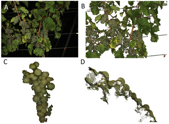 Herrero-Huerta et al. [20] constructed point clouds of grapevines using their own MVS software and images of slightly defoliated grapevines taken at daytime from hand with a single consumer camera. The point clouds were metrically scaled by detecting scale targets of known size in the images. The grape bunch volume, bunch weight and number of berries were then extracted using empirical correction factors, convex hull, as well as meshing and CAD techniques. They reached correlation factors of >75% compared to manually-collected reference data. Considering the potential for high throughput data acquisition, the necessity to attach targets to the grapevines is not feasible. Furthermore, an automatic high throughput system would not to be able to optimize the camera positions towards individual grape bunches.