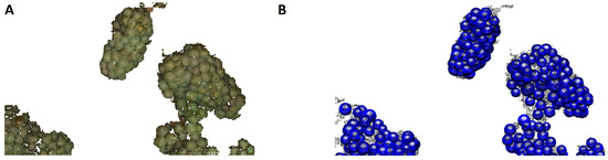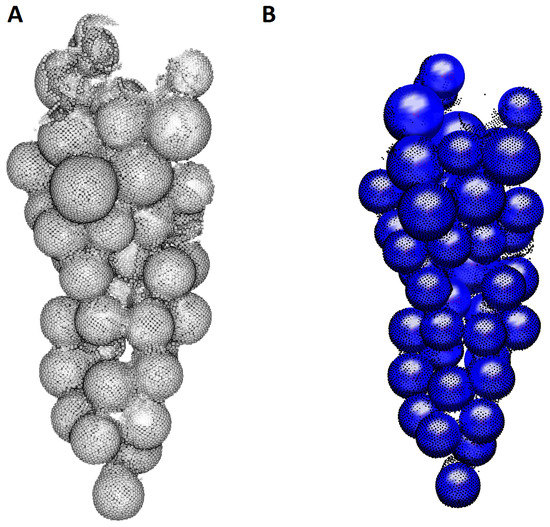 (A) Original points classified as grape bunch class; (B) Berries detected on several components. Almost all berries present in the point cloud are found, with some missing in areas where the spherical shape was not reconstructed properly.