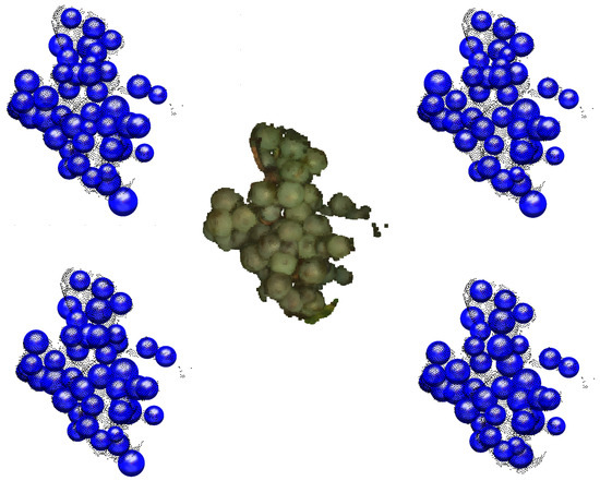 - Position: Does the sphere approximate the space between berries (“valley”) or a berry (“ridge”) (Sphere 3, Figure 11)? Detect spheres lying in the space between berries using the camera positions given by Pix4DMapper. A straight line from the sphere middle point to the nearest camera position is created. If enough points lie on the line, the sphere represents a berry; otherwise, the sphere is located in the space between berries and rejected.