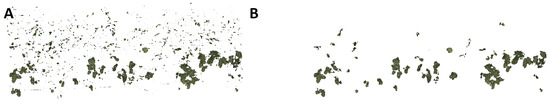 (A) Points classified as grape bunch class. Classification noise can be noticed as small, unstructured point regions; (B) The component size discrimination clears most of the misclassified point regions while keeping the actual grape bunches.