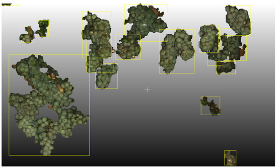 True grape bunches not reconstructed by Pix4DMapper or deleted during yield parameter estimation count as false negatives. A component consisting of several grape bunches, which cannot be differentiated spatially because they are close together, counts as one grape bunch only. For example, a component could consist of five true grape bunches, but is only counted as one grape bunch. This situation would produce four false negatives. Components, which are not actual grape bunches, count as false positives. One true grape bunch divided into, e.g., two components produces one true positive and one false positive. Figure 17 displays several components, indicated by a yellow bounding box. The large single component on the left consists of several true grape bunches and is therefore treated as one grape bunch only. In the right bottom region, components not corresponding to grape bunches can be seen.