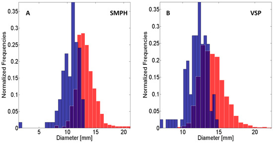 (A) Normalized histograms for the berry diameter of the SMPH row; (B) Normalized histograms for the berry diameter of the VSP trellis row. Red: Estimated with findBerries. Blue: Measured manually in the field. Purple: Area of overlap between both histograms.