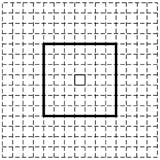 - Determine a buffer: Normally, the grid filter needs to traverse all of the cells of the grid model in order to calculate the probability of each cell. However, the computational load becomes quite high when the number of cells is huge. To reduce the computational load, a buffer mechanism is introduced. A buffer is defined as a subset of a complete grid model, and it represents the search region of a user’s current state. The range of a buffer depends on the user’s previous location and walking speed. As depicted in Figure 2, the buffer in this paper is denoted by a rectangle with a side length of seven-times the cell size (0.7 m) and centering at the previous state, given the fact that a user’s walking distance in one step cannot be over two meters. In the prediction and update stage, we just need to calculate the probabilities of the cells within the buffer and rule out the other cells directly.