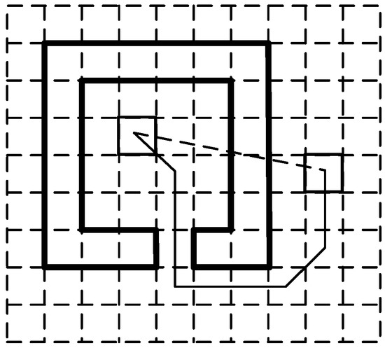 This stage calculates the posterior probabilities of candidate cells, which is followed by the normalization of the posterior probabilities. The weighted mean of the centers of candidate cells is calculated, and the cell that contains the weighted mean is treated as the current estimation. Then, the probability of the cell representing the current estimation is set to one, and the probabilities of the other cells are set to zero. The posterior probability of a candidate cell is determined by two factors. One is the semantics of the cell. That is, if the property of a candidate cell is obstacles or walls, the probability of this cell is set to zero. The other is the difference between the shortest path distance and Euclidean distance between the candidate cell and the cell of the previous estimation. A large distance difference indicates the existence of many obstacles or a big obstacle between two cells, which means overpassing the obstacles in one step is almost impossible. Thus, the larger the distance difference, the lower the probability of a user moving from the cell of the previous estimation to the candidate cell. If the distance difference is over a certain threshold, the probability of the candidate cell will be set to zero. The shortest path distance is calculated by using the A* search algorithm [23]. Figure 3 shows an example of the shortest path distance denoted by a solid line and of the Euclidean distance denoted by a dotted line.