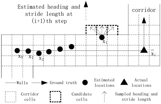 According to the user’s previous state and the currently estimated step length and heading, the candidate cells of the current state can be obtained. Then, the prior probabilities of these candidate cells are calculated by using the formula . Specifically, this stage includes two steps: