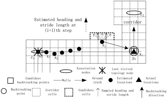 In topological graphs, indoor spaces are represented by nodes and links. Nodes depict key locations in indoor environments, such as rooms, elevators and stairs. Links represent connectivity among nodes, such as corridors and passages. To reduce the time consumed by the backtracking process, a topological graph is used to represent candidate backtracking points and the connectivity among them. The candidate backtracking point corresponds to a corner in an indoor environment, and the connectivity refers to a passage or a corridor that links candidate backtracking points.