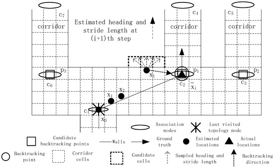 In this case, several neighboring passages probably exist, and the heading error might be the main reason for the dead ending rather than the step length model. Therefore, the model parameter cannot be calibrated. As shown in Figure 6, the last visited topology node is , and the location where the dead ending occurs is denoted by . The direction from to is about 90°, while the directions from to , and are all around 90°. Thus, , and will be chosen as the initial candidate nodes. To identify the correct one from these candidate nodes, the corresponding association nodes including , , , , , and are applied. Unfortunately, these three candidate nodes still cannot be distinguished because the directions from to , to and to equal the walking direction in the dead ending states. However, because has a smaller distance to than and , it is selected as the best backtracking point.