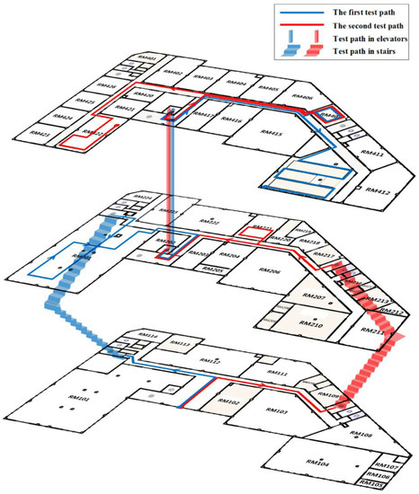 An office building occupied by the China National Engineering Research Center for Geographic Information System (GIS) is selected as our testbed. This building consists of four floors with 3300 square meters for each floor, including an elevator and three staircases. Figure 7 shows the experimental area where two test paths are marked in blue and red solid lines, respectively. The arrow on the paths represents the testers’ walking direction. The two paths cover three floors, starting from the first floor to the fourth floor. The first path in blue is 365 m long, while the other path in red is 345 m long. Three testers walked along the two paths carrying two different smartphones and collected 24 trajectories in total.