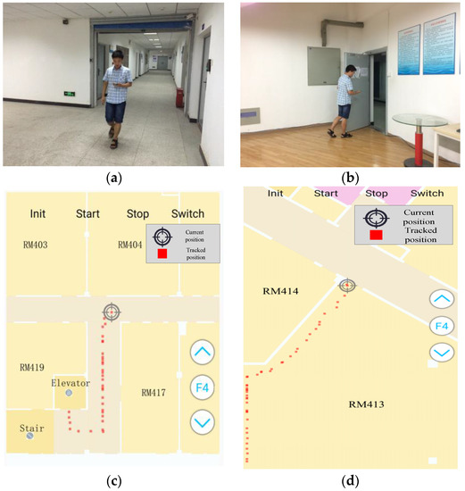 A prototype system has been built and tested on the Samsung Galaxy S Note 4 smartphone with a 2.7-GHz CPU and the Google Nexus 6 smartphone with a 2.7-GHz CPU. Figure 9a,b shows the snapshots of two test areas where one of the testers was walking down a corridor and walking through a door, respectively. Figure 9c,d shows the in-time trajectories in the two test scenes. The floor plans of the three floors were divided into small tiles (256 × 256) and stored on smartphones, while the grid models and the topological graphs were stored in the smartphone’s SQLite database. When the app was launched, a user could choose the map of their current scene and location by pinning the map. The app then started to track the user and update the location on a per step basis. Apart from tracking users online, raw sensor (e.g., accelerometers, gyroscopes, compasses and barometers) data were also automatically collected and stored on phones for the convenience of analyzing and evaluating the performance of different localization algorithms by offline processing.