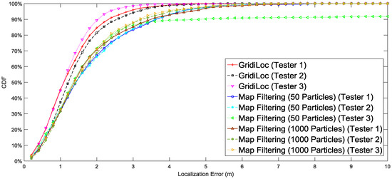 Figure 10 illustrates the localization result of different solutions. The result shows that our solution tracks users with an accuracy of 2.5 m 95% of the time, while map filtering with 1000 particles achieves only an accuracy of 4 m 95% of the time. When the particle number decreases to 50, map filtering achieves an accuracy of 5 m 95% of the time. In order to show the influence of different smartphones and different testers on the localization performance, the complete localization results in Figure 10 are separated according to testers and smartphones. Figure 11 shows the localization results for three different users. The results reveal that the difference in testers’ heights and walking patterns has an effect on the localization performance. Figure 12 shows the localization results for two smartphones, from which we can see that a slight difference exists between the localization performances of the two smartphones.