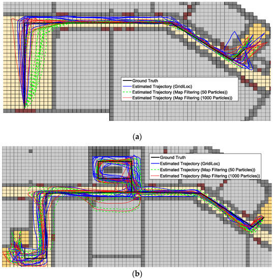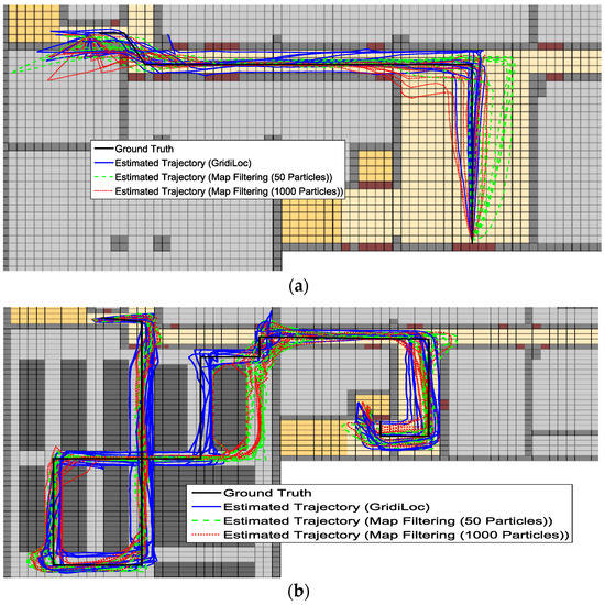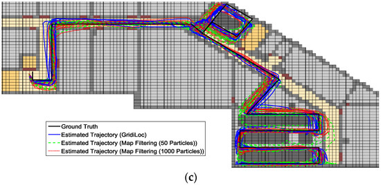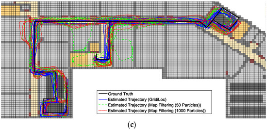 Figure 13a–c illustrates the estimated trajectories by GridiLoc and the map filtering approaches on the different floors along the first testing path. Similarly, Figure 14a–c shows the estimated trajectories along the second testing path.