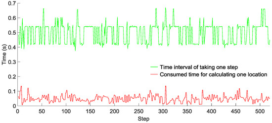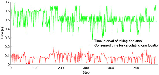 To evaluate the computational complexity of our GridiLoc algorithm running on smartphones, two testers walked down a long corridor, and the time of taking one step and that of calculating one location with the grid filter were recorded, as shown in Figure 15 and Figure 16, respectively. Tester 1 walked 520 steps in 272 s, while Tester 2 walked 580 steps in 328 s. The average time of taking one step is 0.52 s for Tester 1 and 0.55 s for Tester 2, while the average time of calculating one location in two tests is 0.05 s and 0.08 s, respectively. Obviously, the time of calculating one location is much smaller than the time of taking one step. The result reveals that most of the time, the GridiLoc program is free and waiting for the incoming of sensor measurements. It also proves the low computational complexity of the proposed grid filter approach. For a backtracking process, it is T (T = 5) times long than the time of calculating one location. We believe the extra time consumption from the backtracking process is acceptable considering its great advantages in improving the localization accuracy and reliability.