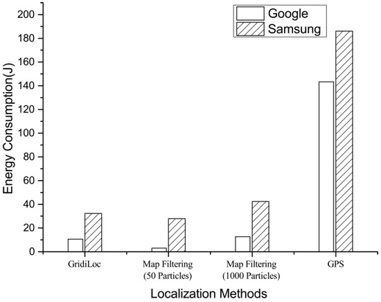 This experiment evaluated the energy consumption of GridiLoc, map filtering and GPS on two android smartphones: Samsung Galaxy S Note 4 and Google Nexus 6. To test the energy consumption of GridiLoc and map filtering, two testers walked along one of the test paths illustrated in Figure 7 12 times in total. The GridiLoc app and map filtering app were deployed and ran on the two smartphones. To test the energy consumption of GPS, the two testers walked along an outdoor path 12 times in total and with the GPS program running on the two smartphones. The method proposed in [24] was utilized to record the energy consumption of a program on android smartphones. The average time of conducting one indoor or outdoor test is about 340 s. The average energy consumption of six tests for each smartphone is illustrated in Figure 17, from which we can see the map filtering approach with 50 particles consumes the least energy. Nevertheless, GridiLoc consumes less energy than the map filtering approach with 1000 particles. This is mainly because of the adaptation of the buffer mechanism with which GridiLoc just needs to calculate the probabilities of the cells in the buffer (e.g., a 7 × 7 matrix) for one estimation. On the contrary, the map filtering approach needs to calculate the probabilities of all of the particles (e.g., 1000) for one estimation. We believe the energy consumption of our method is acceptable since it achieves much higher localization accuracy than the map filtering approaches. Furthermore, our method consumes much less energy than GPS, which is widely used in navigation applications nowadays. Furthermore, many solutions can be adopted by software engineers to reduce the energy consumption of a program before bringing it to market.