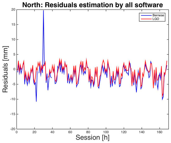 Milano test. North residuals of hourly sessions. BSW5.2 in blue, LGO in red.