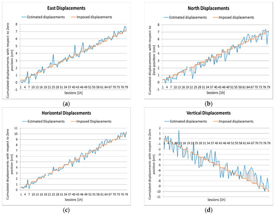 Baseline between the primary reference and rover. Hourly sessions: comparison between imposed and estimated displacements. (a) East; (b) north; (c) horizontal; and (d) up.