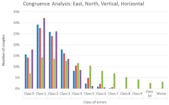 Figure 6 provides the detail of the results. In Table 9 the cumulated percentages are shown. The congruence analysis in the east direction provides rather satisfactory results: 66% of the couples are in class 0–2, while the maximum class error is 8 for just one result; north results are still satisfactory, but slightly worse. The 2D analysis performs better than individual east and north results. Vertical results are worse, with a significant percentage of class errors (40%) exceeding class 4.
