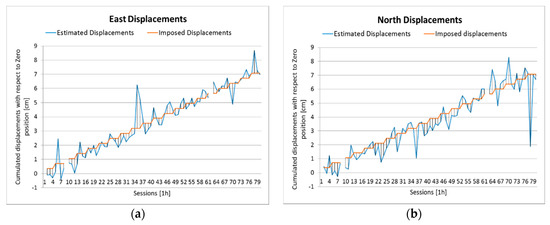 Baseline between the secondary reference and the rover. Hourly sessions. Comparison between imposed and estimated displacements. (a) East; (b) north; (c) horizontal; and (d) up.