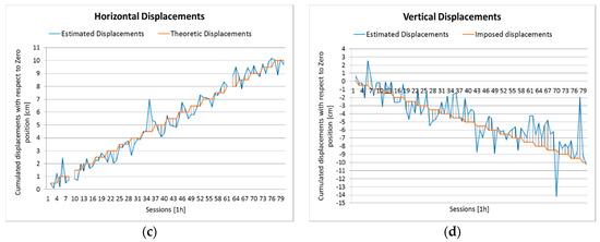 Clearly, the typical pattern in time of local deformation phenomena does not follow such a regular stepwise behavior: our test is only a discrete simulation of displacements aimed at assessing the reliability of the system to identify them. By the end of the experiment, the position of the antenna was moved 10 cm in the horizontal plane and 10 cm in the vertical with respect to the initial (zero) position. During the nights no movements were applied: about 12 hourly sessions correspond to each night position but for homogeneity with other positions, only the first two hours were used and processed.