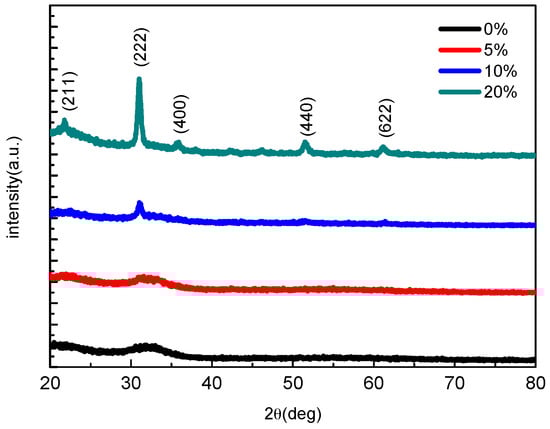 Figure 2 shows XRD patterns of the IGO films. The film is amorphous under 0% oxygen. Numerous peaks are observed from the samples under higher oxygen partial pressure. The peak intensities increased and the full width at half-maximum (FWHM) decreased as the oxygen partial pressure increased, indicating that the crystalline qualities are improved. The peaks (222), (440), (400), and (622) observed in IGO film fabricated under 20% oxygen partial pressure are consistent with the phase of In2O3. It is obvious that the 20% IGO film shows a polycrystalline phase.