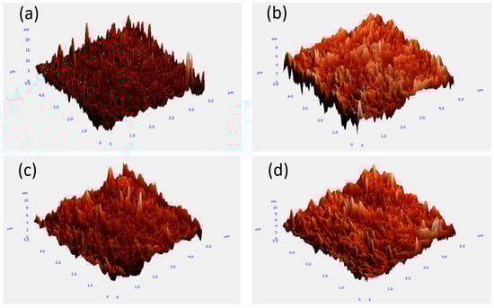 Atomic force microscope (AFM) images of the IGO films sputtered under (a) 0%; (b) 5%; (c) 10%; and (d) 20%.