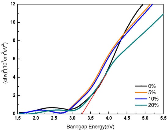 Figure 3 shows AFM images of the IGO films. The scanning areas were 5 μm × 5 μm. The root mean square surface roughness of the 5%, 10%, and 20% films were 0.879 nm, 1.097 nm, and 1.088 nm, respectively. The smooth surface of the films lead to lower surface density of states, which is beneficial for the performance of the devices [15]. Figure 4 shows optical absorption spectra of the IGO films. The bandgap of IGO is approximately 3.1–3.3 eV. The bandgap of the sample fabricated under 20% rises to 3.3 eV, with strong absorption for photons with wavelength shorter than 380 nm. It can be ascribed to the larger binding energy of GaO, and the formation of GaO decreases the conductivity of the film. The excess oxygen could bind with In atoms stably, leading to the apparent crystalline phase. The results of electrical measurement can also prove this deduction. Transmittance spectra of different partial pressure are shown in Figure S1 of the Supplementary Materials.