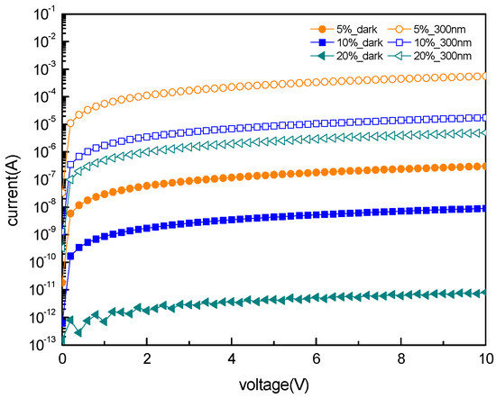 The current–voltage characteristics of the IGO photodetector are shown in Figure 6. The dark current of the devices fabricated under pO2 = 5% and pO2 = 10% changes linearly with bias from −10 V to 10 V, as shown in Figure S2a and Figure S2b of the Supplementary Materials. This indicates that they are ohmic devices. The dark currents for pO2 = 5%, 10%, and 20% are 3.03 × 10−7 A, 8.93 × 10−9 A, and 8.1 × 10−12 A at 10 V bias, respectively. The small dark current of the 20% fabricated device is attributed to the high Schottky barrier height and the reduction of the oxygen vacancies in the film. The Schottky characteristic is proved by Figure S3 in the Supplementary Materials. During the photocurrent measurement, the devices were illuminated under 300 nm UV light. The photocurrents for pO2 = 5%, 10%, and 20% are 5.63 × 10−4 A, 1.74 × 10−5 A, and 4.99 × 10−6 A, respectively.