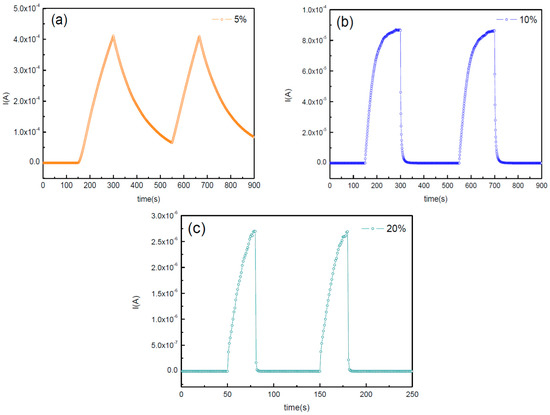 Time-dependent photoresponse of the IGO photodetector with (a) 5%; (b) 10%; and (c) 20%.
