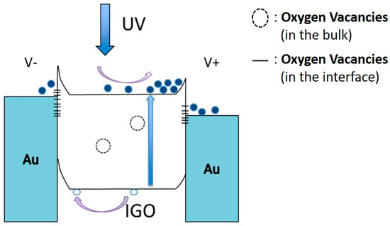 Based on the above experimental results and analysis, the band diagram is shown in Figure 9 to explain the whole mechanism. For 5% and 10% fabricated devices, although there is sufficient barrier height between Au and the IGO films, the large number of positively charged oxygen vacancies in the interface narrows the depletion region, increasing the probability of electronic transport by tunneling [24]. As a consequence, the dark current is usually larger in the ohmic-type devices. During the illumination, the additional photon energy separates the electrons and holes. The excited electrons tend to move toward the conduction band; however, the vacancies in the film might capture and trap electrons. The large dark current and the trapping mechanism lead to a lower photo/dark current ratio. For the 20% fabricated device, the defects in the film are restrained, so it becomes a Schottky-type device. During the dark current measurement, the transport process is dominated by thermionic emission of carriers through the barrier; hence, the dark current is apparently reduced. Under UV illumination, the redistribution of space charge gives rise to an increase in positive charge density in the depletion region, causing the barrier to shrink [25]. Therefore, the tunneling probability increases. Both small dark current and the increasing tunneling probability lead to relatively high photocurrent/dark current ratio.