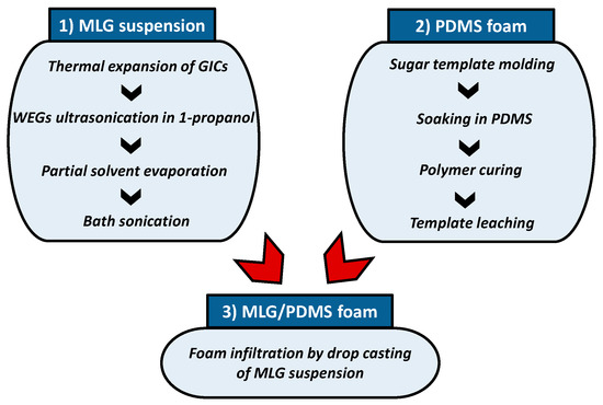 This section is aimed at describing the procedure developed for the production of soft porous MLG/PDMS materials with pressure sensing capabilities. As sketched in Figure 1, the process consists of three main distinct steps: (1) preparation of MLG-based colloidal suspensions; (2) production of PDMS open-cell foams; (3) infiltration of the porous PDMS with MLGs colloidal suspension.