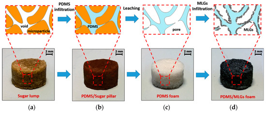 The main steps to obtain piezoresistive MLG/PDMS foams.