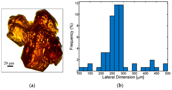 The mechanical behavior of the polymeric foams is related to their microstructure and to the properties of the polymer itself. Their physical characteristics, such as pore dimensions and porosity, depend on the shape, size and amount of the porogens. The degree of inter-connectivity between pores is affected by the fusion process between adjacent particles of the template prior to the polymer infiltration. In Figure 4a, we show the optical image of fused sugar crystals. Through the analysis of hundreds of pictures, the frequency distribution of the maximum lateral dimension of porogens is extracted and plotted in Figure 4b. It can be noted that most of the particles are characterized by a maximum size of 250–300 μm, with an average value of nearly 270 μm. Figure 5 shows the cross section of a PDMS foam after leaching. As expected, the polymer structure displays the negative replica of the sugar particles based template: pores have dimensions of few hundreds of micrometer and are composed of microperforated walls, leading to an open-cell porous structure. The pore interconnectivity is fundamental for the final realization of a soft conductive foam. In fact, a closed cell sponge would be denser and, most importantly would impede the infiltration of the MLG/propanol suspension throughout the material. It is important to remark that the size of nanoplatelets in 1-propanol also represents a critical parameter as it affects the liquid flow through the foam and the electrical properties of the porous structure. The proper setting of the process parameters during the thermal expansion of GICs and WEG sonication allows to optimize MLG exfoliation [14], thus avoiding to plug foam pores with too large nanoplatelets or to produce pulverized graphene flakes with very low-aspect ratio.