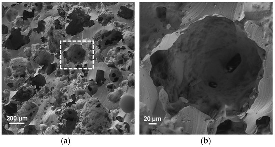 (a) SEM image of the cross-section of a PDMS foam after leaching of a preformed sugar based template; (b) Higher magnification view of the pore marked in (a).