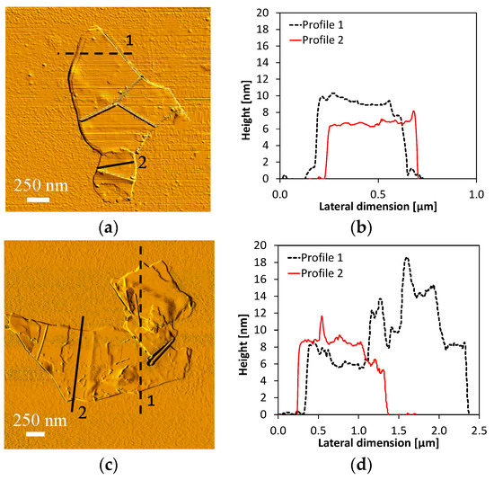 Figure 6a,c shows, as an example, two AFM images of MLGs with their measured thickness profiles (Figure 6b,d). An extensive investigation demonstrated that the produced multilayer graphene sheets have an average thickness of 8–10 nm and lateral dimensions in the range of few micrometers.