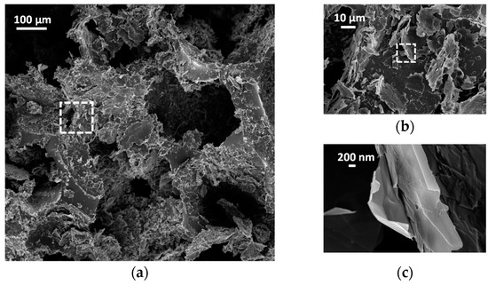 (a) SEM image of a MLGs coated PDMS foam; (b) Higher magnification view of the area marked in (a); (c) Higher magnification of flakes marked in (b).