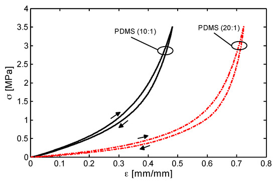 At first, cylindrically-shaped bulk PDMS samples obtained with two different base/curing agent mass ratio (i.e., 10:1 and 20:1) are subjected to a uniaxial quasi-static compression test at a crosshead speed of 1 mm/min up to a maximum stress of 3.5 MPa. The loading/unloading stress (σ)—strain (ε) responses are showed in Figure 8. The presence of small hysteresis loops (area between loading and unloading curves) are related to the viscoelastic properties of the material [24]. The curves demonstrate distinctly the superior flexibility of the PDMS specimens produced with the lowest content of curing agent (i.e., 20:1) in the whole investigated deformation range. This is also confirmed by the values of the compressive Young’s modulus EPDMS, evaluated at low strain in the linear region and reported in Table 1.