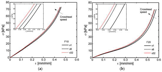 Monotonic compression tests are then performed to investigate the response of PDMS foams belonging to both F10 and F20 families. The obtained stress-strain characteristics are plotted in Figure 9a,b up to 70 kPa. Due to the lower cross-linking degree of the PDMS used, foam of the F20 family shows higher deformations than samples of the F10 one at the same stress level. Notice that the characterization is performed at different crosshead speeds v, ranging from v1 = 1 mm/min to v32 = 32 mm/min, which correspond to a quasi-static strain rate () of ~0.0026 s−1 and ~0.082 s−1, respectively [25]. The reason is that polymeric foams generally exhibit high degree of sensitivity to [26], which is defined as the derivative of the strain with respect to time or, equally, as the ratio between the crosshead speed v and the original thickness h0 of the gradually compressed sample. Such dependency of the stress-strain curve from the cross-head speed is usually related to the properties of PDMS and to the presence of air inside the foam. In our experiment, as shown in Figure 9, we observed a very slight change of the strain-stress response for increasing values of the crosshead speed: stepping up the crosshead speed from v1 to v32 the stiffness and compressive strength increase to a small extent, especially at higher induced strains. Tests conducted at much higher strain rates would be of special interest for impact and shock absorbing applications [25], but are out of the scope of the present work.