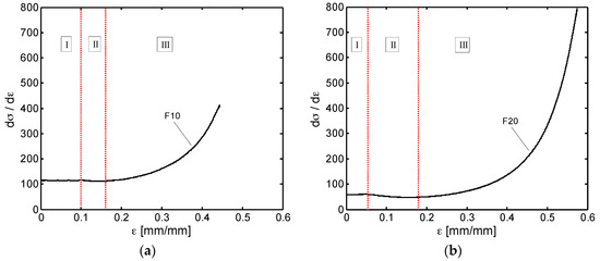 The above mentioned three characteristic phases of deformation are not well defined in Figure 9 mainly because of the random size and shape distribution of the pores in the produced PDMS foams. In order to highlight the transitions from one regime to the other for both the foam types (i.e., F10 and F20 families), we report in Figure 10 the stress first derivative with respect to strain (dσ/dε).