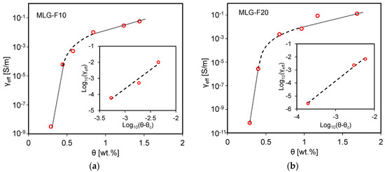 The effective dc electrical conductivity (γeff) of the coated foams MLG-F10 and MLG-F20 as function of the MLGs weight fraction θ [wt.%] is reported in Figure 11a,b respectively. As expected, γeff increases with θ. In particular, between the 0.3 wt.% and 0.4 wt.% of MLGs, γeff increases steeply of about four orders of magnitude for both the foam typologies, whereas a much slower variation is observed at concentration higher than 1.2 wt.%.