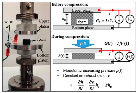 The electrical resistance of the foams after MLG infiltration is measured using a two-wire volt-amperometric technique, through a Keithley 6221 dc/ac current source (Keithley, Cleveland, OH, USA) connected to a Keithley 2182 nano-voltmeter (Keithley, Cleveland, OH, USA) and controlled by a laptop for data acquisition. In particular, the foams are firstly sandwiched between two aluminum platens, working as electrodes. Notice that the platens have been properly designed to be screwed to the compression fixture. The wires are then attached to the electrodes and connected to the measuring units. The effective dc conductivity (γeff) of each MLG/PDMS foam sample is obtained from the corresponding measured resistance, diameter and thickness values.